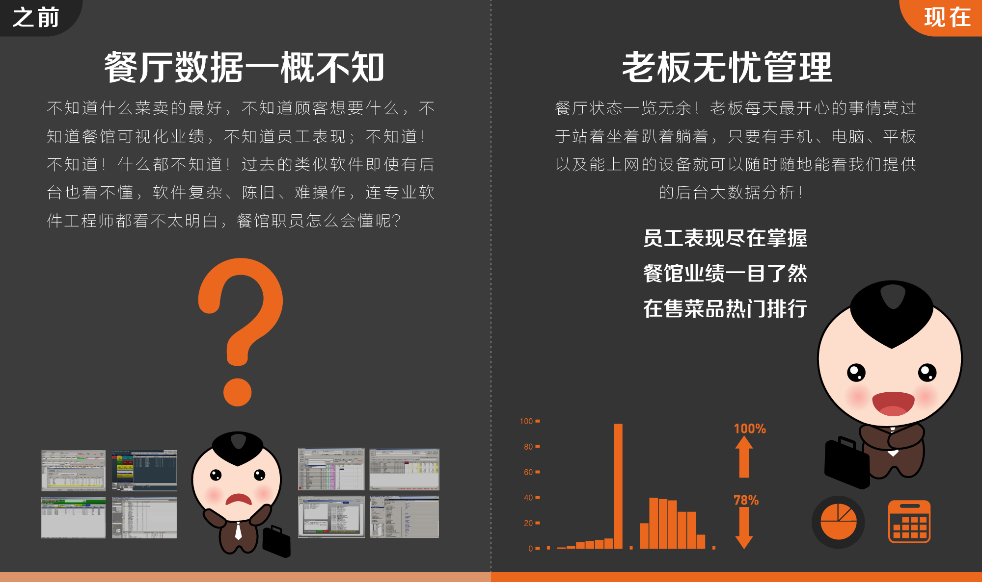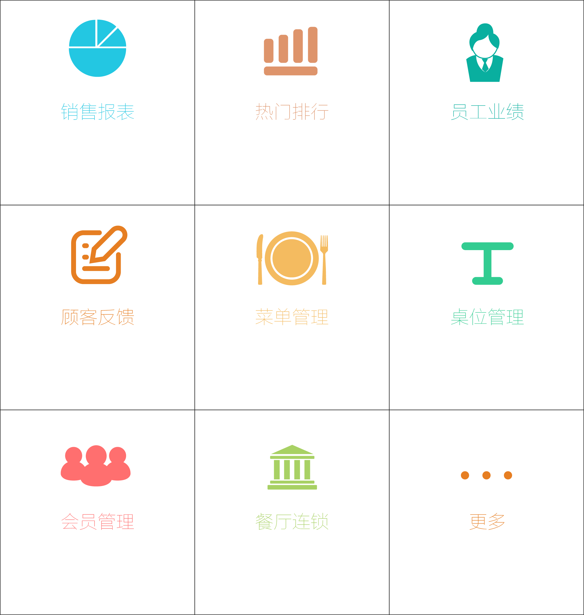 后台功能强大,权限控制严谨。销售报表、热门排行、员工业绩、顾客反馈、菜单管理、桌位管理、会员管理以及餐厅连锁等尽在掌握;全面规范餐厅运营,有效规避管理漏洞。高度定制,无缝对接餐厅现有系统,统一管理后台,减少用户操作流程与经营成本。