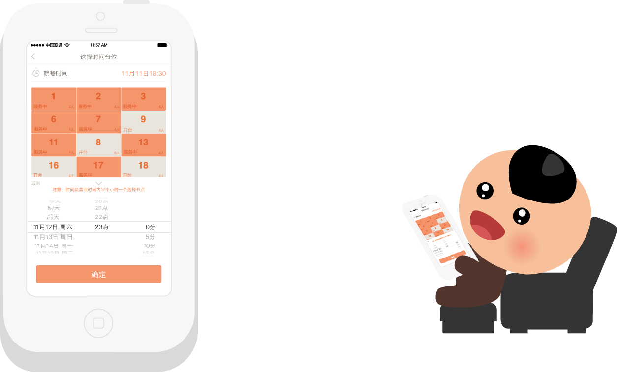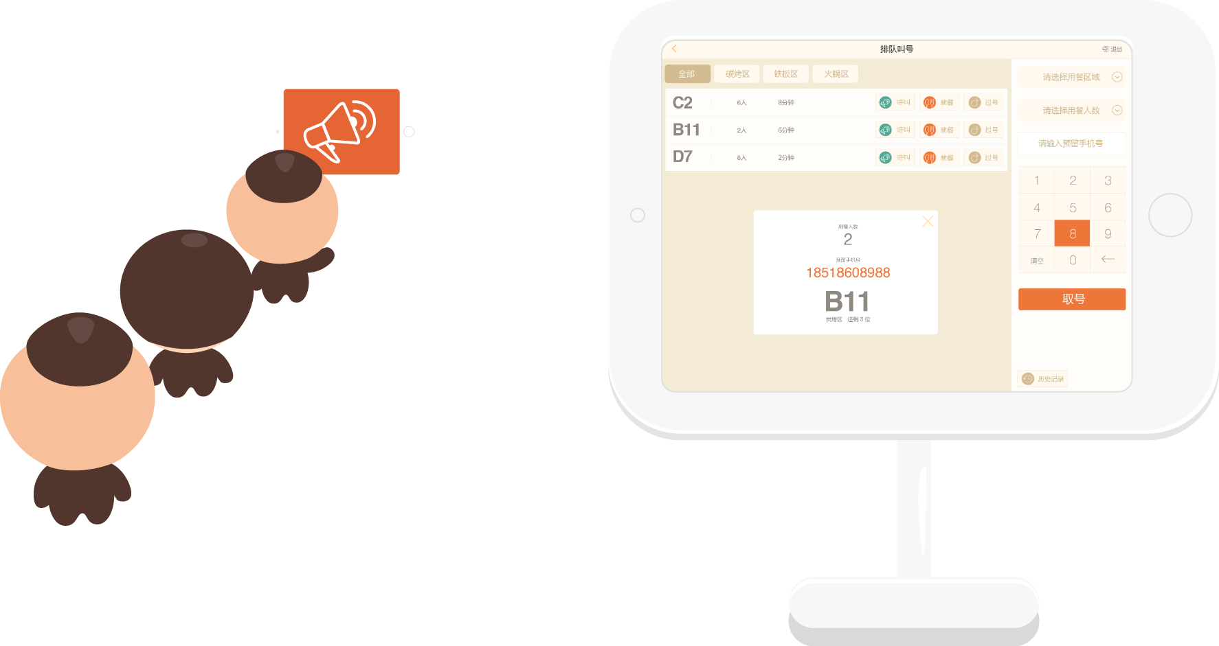 服务员发号,顾客自取小票;等位时间、人数、手机号